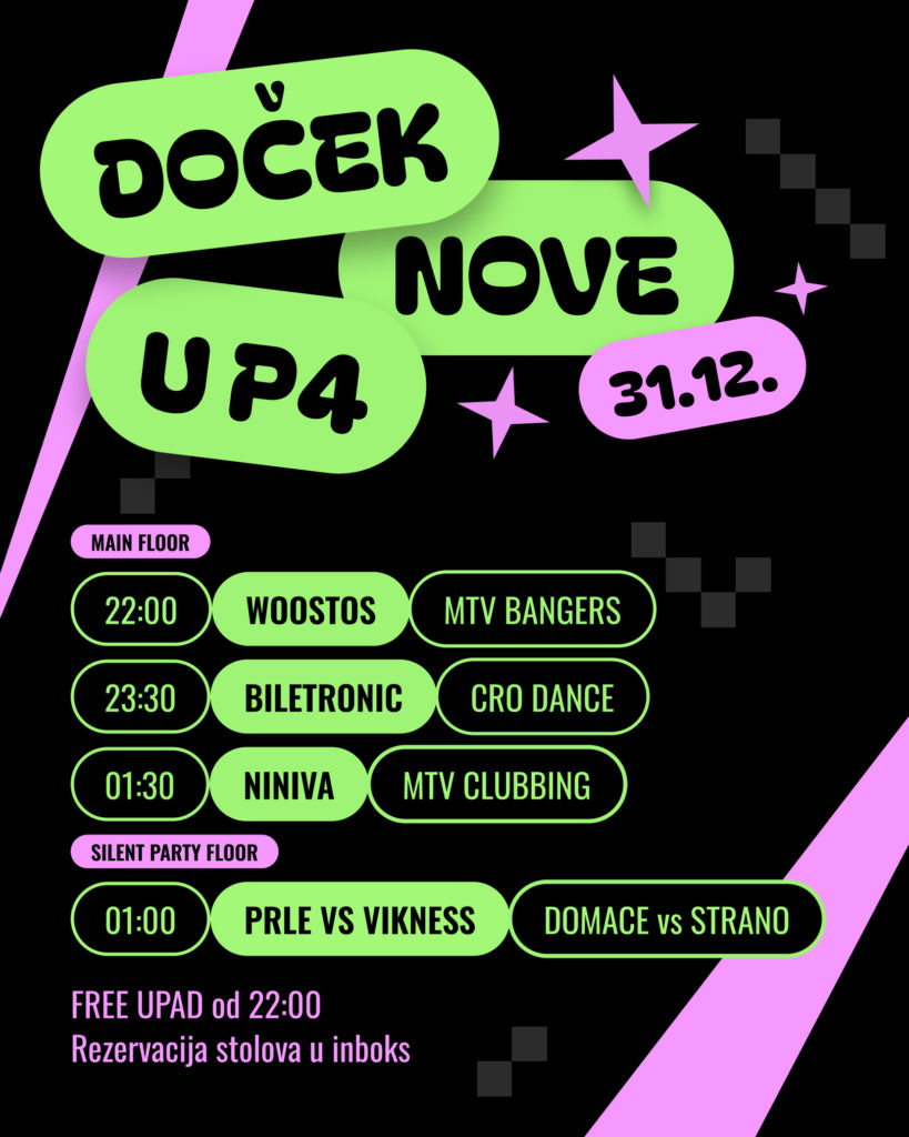 DOČEK U P4 ide jako ove godine – pripremamo najbolji party (NA DVA FLOORA), pozdravljamo se od lude 2025. (bye bye) i s naj naj najboljim željama dočekujemo 2026. Bit će pun hitova – od Dine Dvornika, Vesne Pisarović, Denis i Denis, Colonije, Gršeta, Miach pa sve do Fred Againa, Charli XCX, Da Hoola, Prodigyja, Plaboy Cartija, Weeknda, Madonne, Rihanne, Justin Timberlakea, Timbalanda, Calvina Harrisa, Dua Lipe, itd.