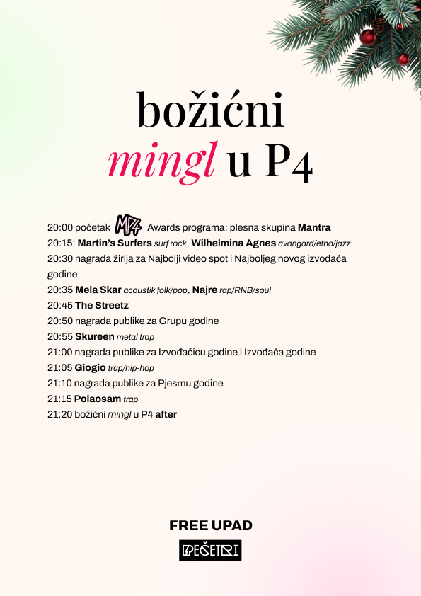 Svečanost i božićni mingl prilika je da damo priznanje za cjelogodišnji trud, kreativnost i želju za stvaranjem mladim artistima i bendovima iz cijele Hrvatske, a koji su bili dio našeg cjelogodišnjeg MP4 programa. Publika je glasala i među finalistima odabrala pobjednike i pobjednice u kategoriji: Izvođač godine, Izvođačica godine, Grupa godine i Pjesma godine, a P4 žiri uručit će nagrade u kategorijama za Najbolji video spot godine i Najboljeg novog izvođača ili izvođačicu godine.