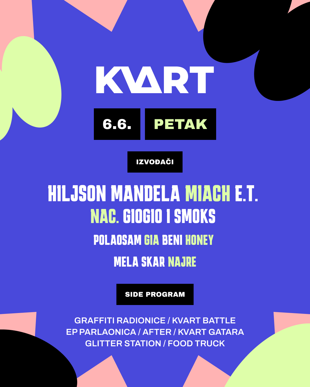 Side program: graffiti radionica, KVART battle, EP parlaonica, Glitter Station, KVART gatara, Food Truck